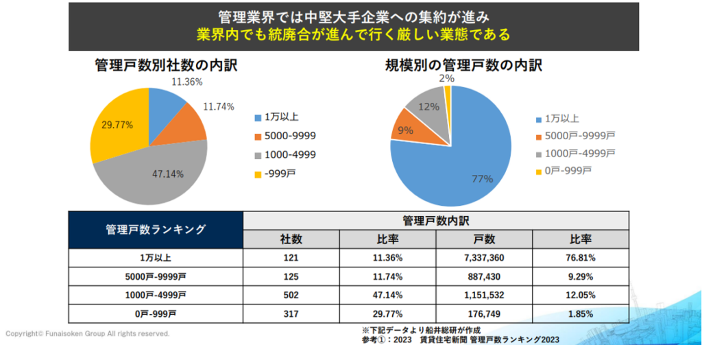 このような状況下では、競争が激化し、大手や中堅企業に顧客が集中する傾向が顕著になっています。特に賃貸管理業界では、管理戸数1,000戸未満の小規模な企業が、社数ベースで約30%を占める一方で、管理戸数ベースではわずか約2%に留まっており、中堅・大手への集約が進んでいる厳しい業態であることがわかります。