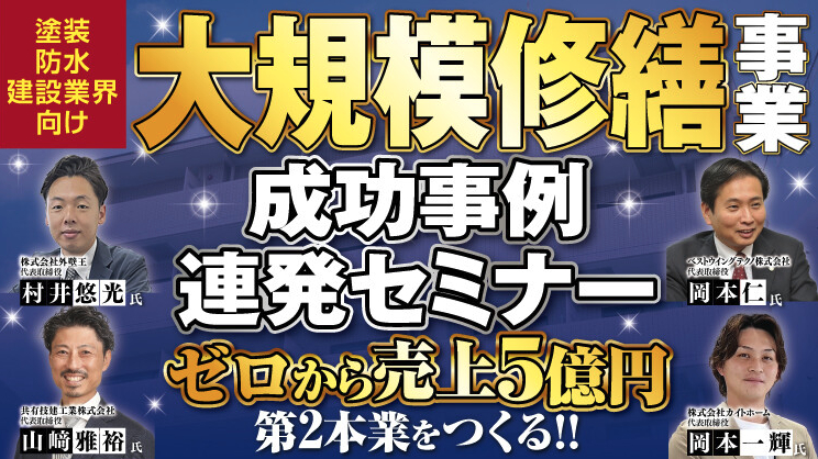今回ご紹介するセミナーでは、実際に地方で成功している大規模修繕事業の最新事例を多数公開いたします。