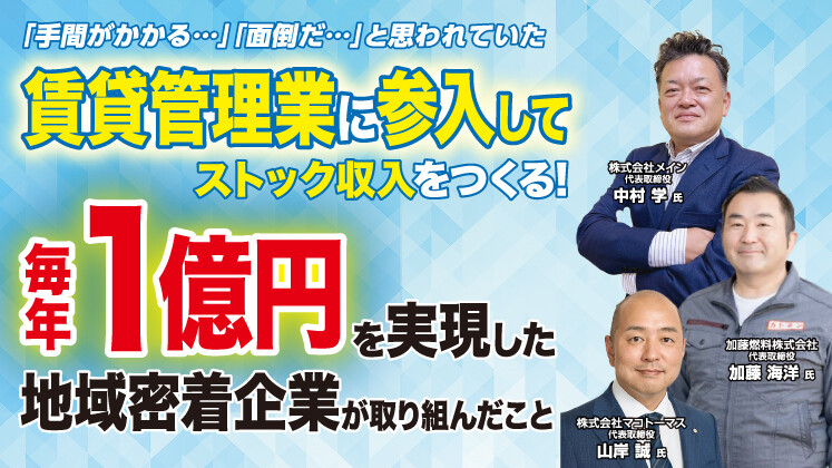 リフォーム業界やガス業界など、地域密着の既存ビジネスから賃貸管理業へ新規参入し、ストック収入1億円を実現した成功企業の経営者様の生の声を聞くことで、成功の秘訣と事業を軌道に乗せるための失敗しない勘所を具体的に学ぶことができます。